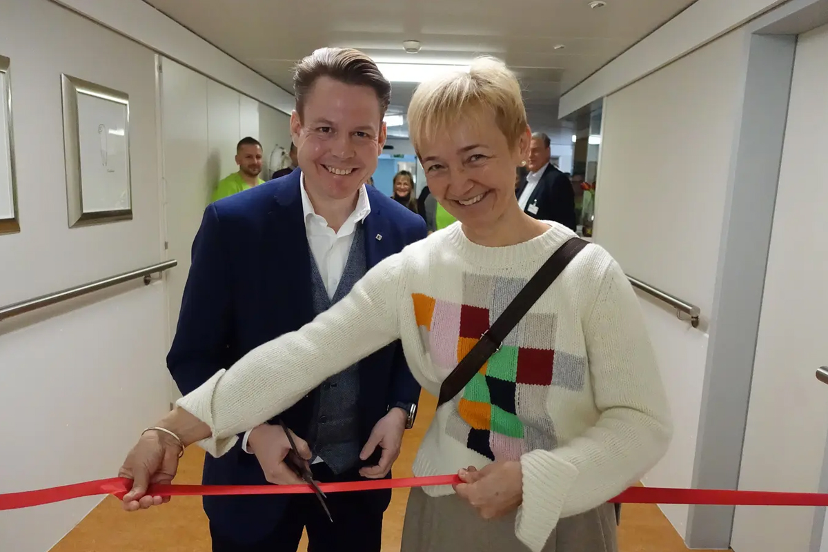Landammann Yves Noël Balmer und die Innerrhoder Gesundheitsdirektorin Monika Rüegg Bless eröffnen mit der Durchschneidung des roten Bandes die im Spitalgebäude von Heiden realisierte Tagesstruktur. Bild: Peter Eggenberger